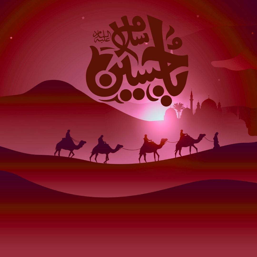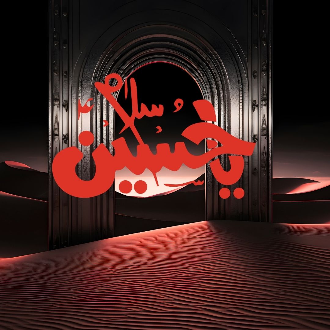 This “Ya Hussain” image portrays a powerful and symbolic scene set in a desert landscape, where a group of people is shown traveling on camels—an artistic reference to the historical journey of Karbala. A mosque illustrated in a striking red color gradient enhances the spiritual and emotional depth of the composition. The red tones evoke themes of sacrifice, courage, and remembrance. At the heart of the image, the beautifully designed Arabic calligraphy of “Ya Hussain” in red adds a unique and profound touch, making the artwork a meaningful tribute to Imam Hussain (A.S) and the legacy of Muharram.