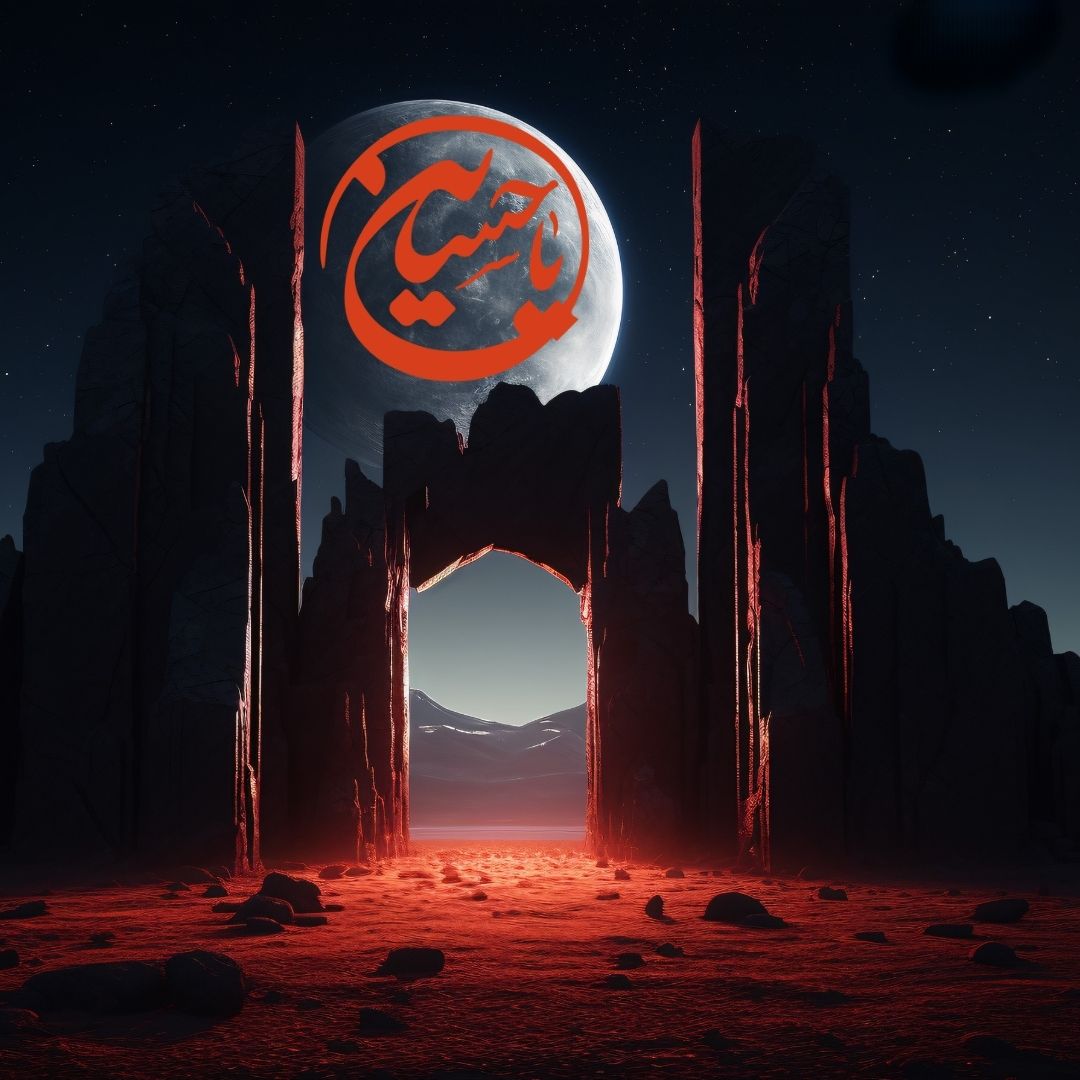 This “Ya Hussain” image presents a powerful and symbolic desert landscape in deep red tones, featuring rugged rocks and distant mountains that evoke the harsh terrain of Karbala. At the center, a striking gateway-like passage formed between two large rock formations suggests a spiritual path or entry into a sacred journey. Above, the dark night sky is illuminated by a solitary moon, casting a quiet, solemn light over the scene. The powerful symbolism is heightened as “Ya Hussain” is elegantly written on the moon itself, linking the celestial with the earthly in a tribute to the legacy of Imam Hussain (A.S). This imagery evokes deep emotion and reverence, capturing the essence of sacrifice and devotion in the face of adversity.