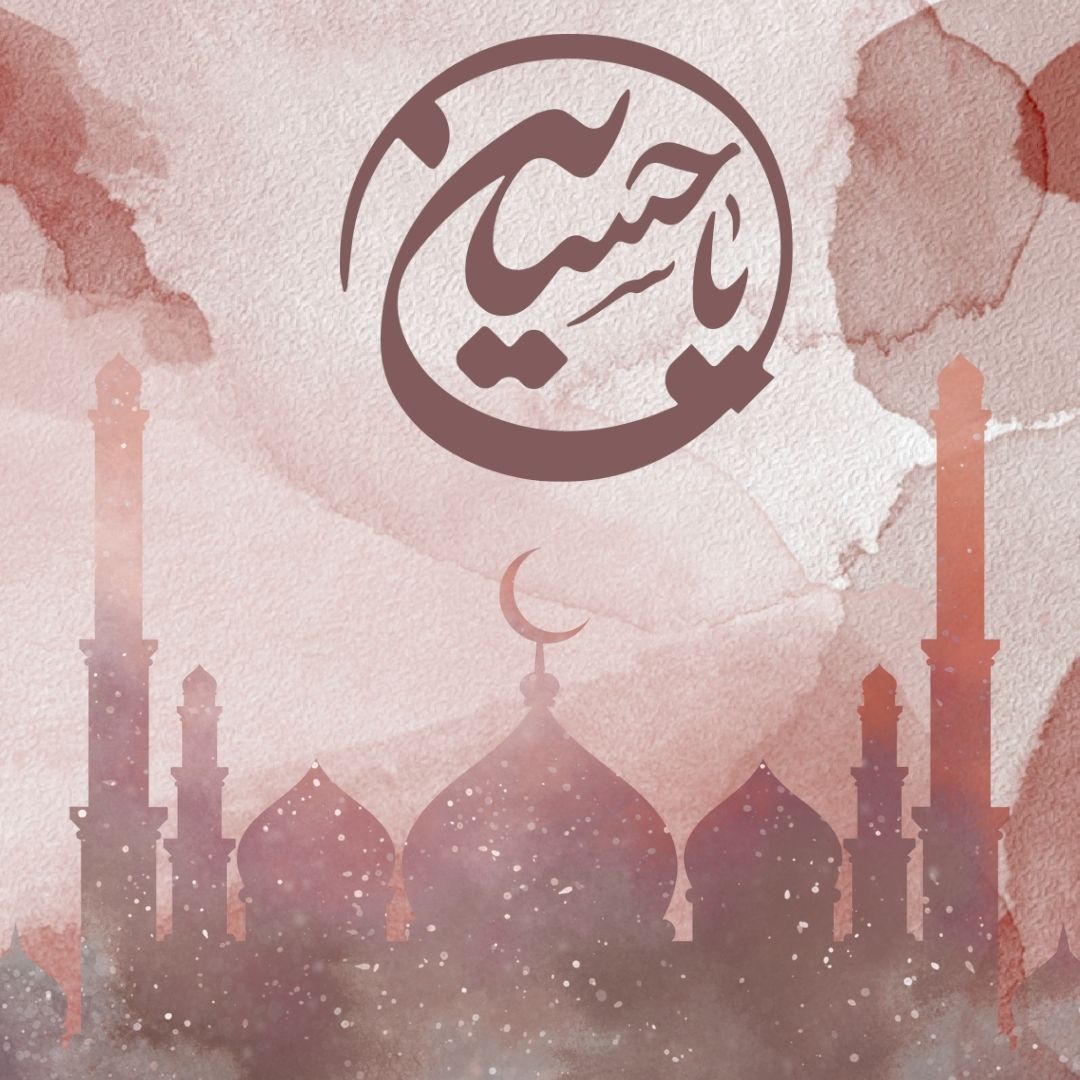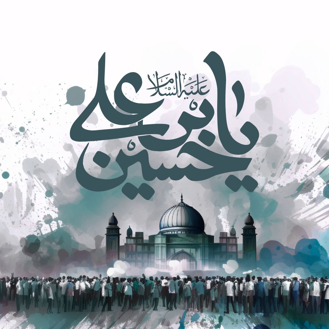 This “Ya Hussain” image features a powerful and emotional scene with a beautifully illustrated mosque in the background, symbolizing reverence and faith. In the foreground, a group of people is depicted, representing unity, devotion, and remembrance, often associated with the gatherings during Muharram. The use of abstract colors adds a sense of spiritual depth and artistic richness to the design. At the center, the name “Ya Hussain” is written in elegant Arabic calligraphy, serving as a striking tribute to Imam Hussain (A.S) and evoking the essence of his sacrifice and legacy in Islamic history.