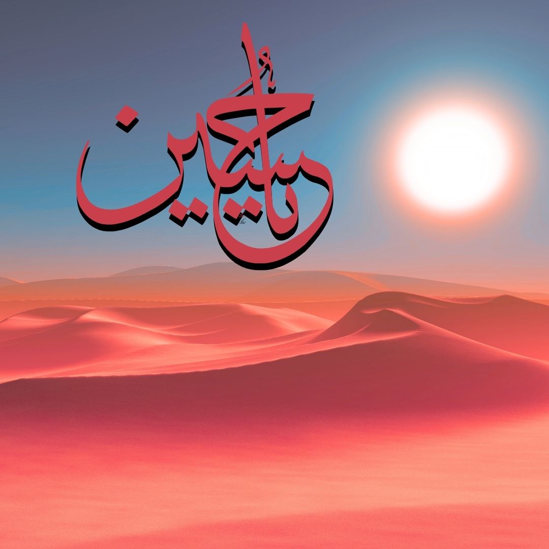 This “Ya Hussain” image powerfully portrays a desert scene bathed in rich red and golden gradients, evoking the intense emotion and solemn atmosphere of Karbala. The red sky adds a dramatic tone, symbolizing both the sacrifice and the spiritual depth of Imam Hussain’s (A.S) stand for justice. At the center of the image, the name “Ya Hussain” is beautifully written in Arabic calligraphy, serving as a striking focal point. The combination of the desert landscape with warm, symbolic colors and artistic calligraphy creates a heartfelt and visually moving tribute to the enduring legacy of Hussain Ibn Ali.